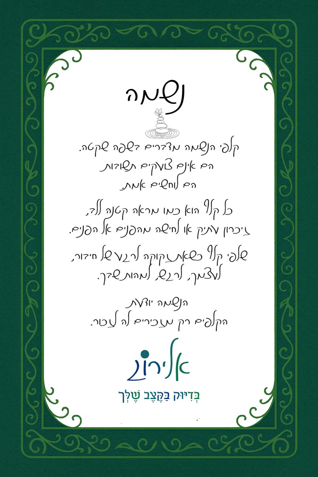 הזמיני עכשיו את קלפי נשמהשל אלירוג ותני למילים לרכך, להאיר ולהחזיר לך את השקט הפנימי.